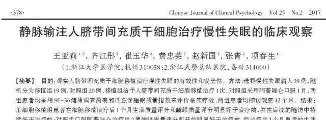 2017年,發(fā)表在《中國臨床心理學(xué)》雜志的一項臨床觀(guān)察成果顯示,靜脈輸注臍帶間充質(zhì)干細胞可長(cháng)期改善慢性失眠患者的睡眠質(zhì)量。