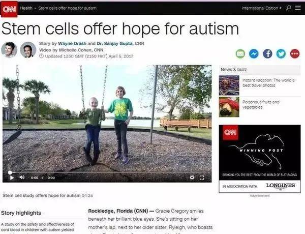 美國CNN電視臺近日報道了佛羅里達州羅克利奇市的一個(gè)臍帶血干細胞減輕兒童自閉癥癥狀與行為的臨床試驗。