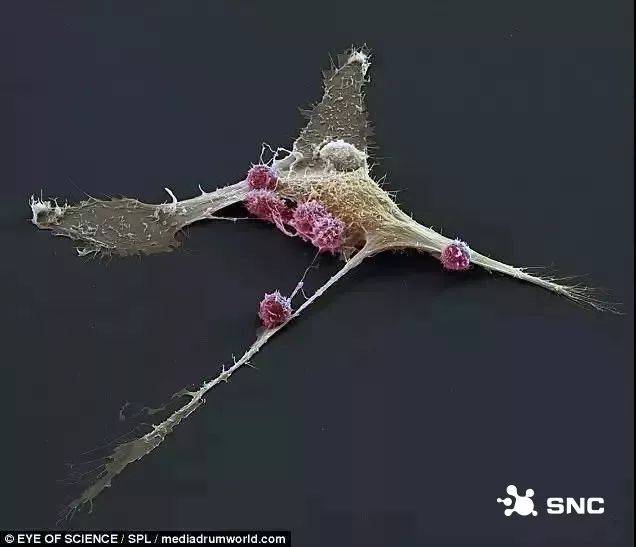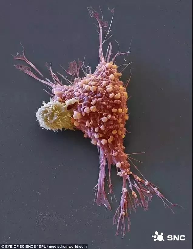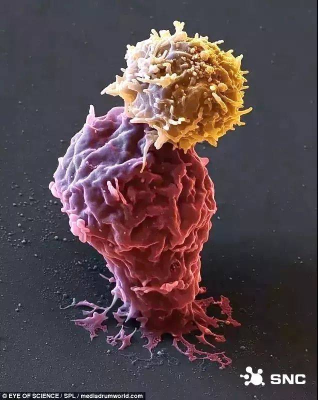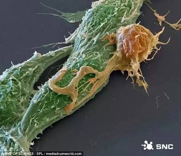 不僅乳腺癌,該掃描電子顯微鏡照片顯示CAR-T細胞(橙色)正在攻擊白血病細胞(紅色)。